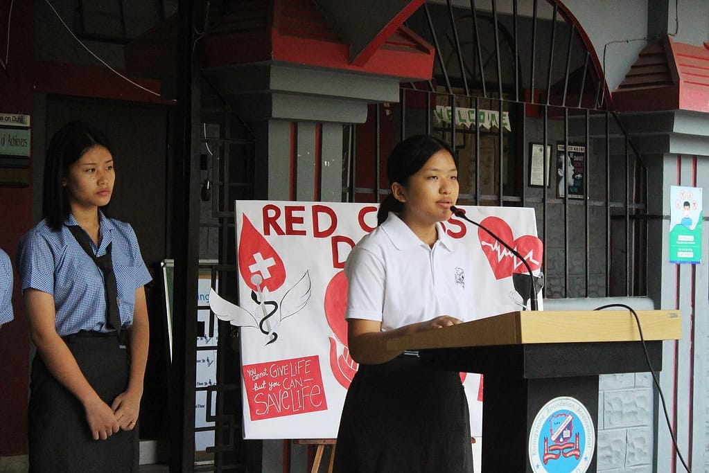 The programme which began at 8:30 AM was marked by a special speech on the significance of the day by Miss Erano Ezung of Grade-IXA. In her speech she highlighted the main reason for celebrating this day which was to commemorate the principles of the Red Cross Society and the Red Cross Movement. She also stated that this day was established as an international event in order to honour Sir Henry Dunant, who was the founder of the International Red Cross Committee. According to her, the Red Cross Society helps the people ravaged by wars, fires, earthquakes and such other calamities. She also called upon the students and mentors to celebrate this day to encourage one another to be kind and empathetic towards everyone.